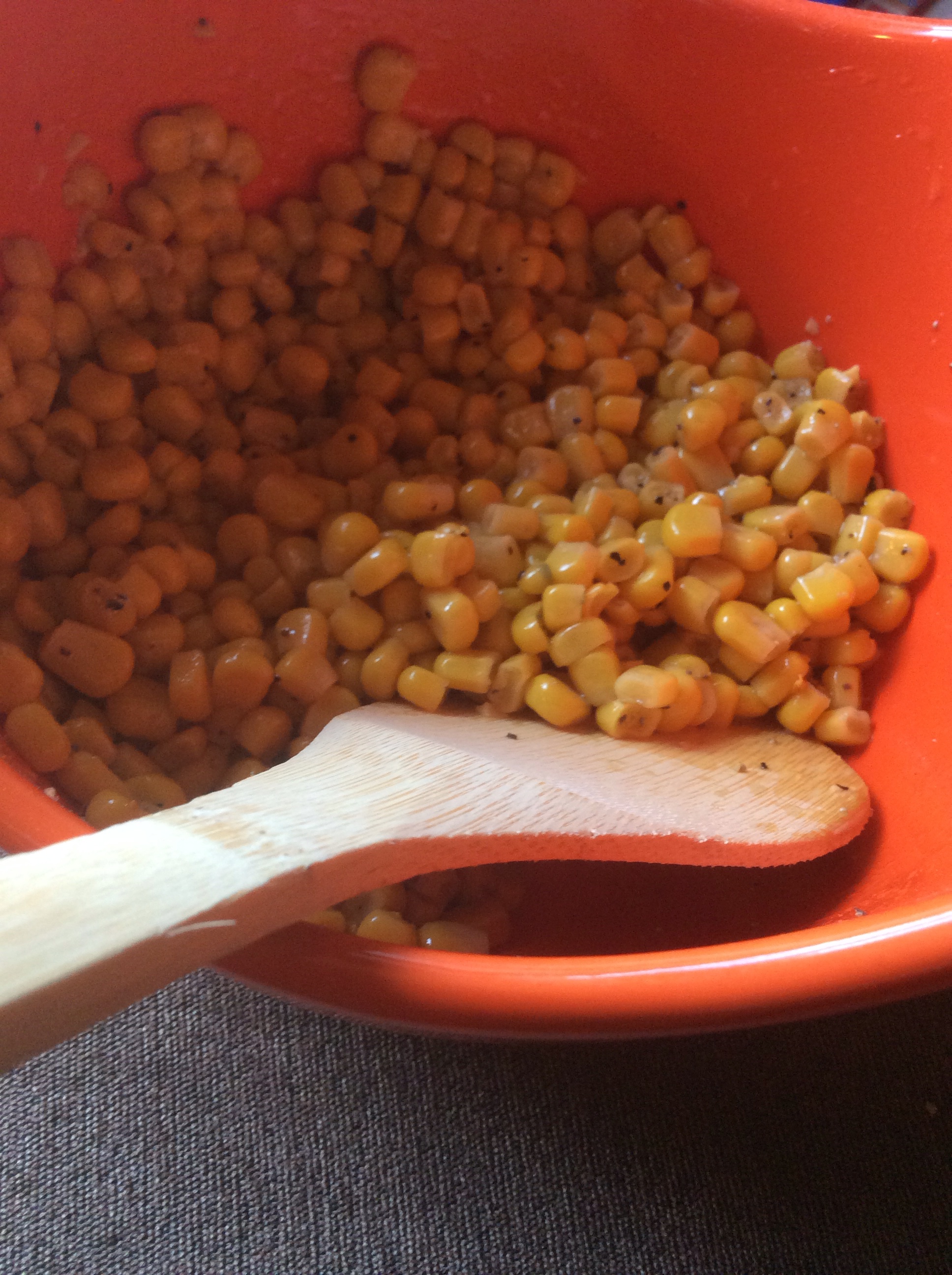 Once the pasta is al dente, drain water and place pasta in a medium size bowl. Add 1 tbsp of extra virgin olive oil, 1 tbsp of “can’t believe it’s not butter” and salt and pepper to taste. Mix the pasta so it is completely coated.