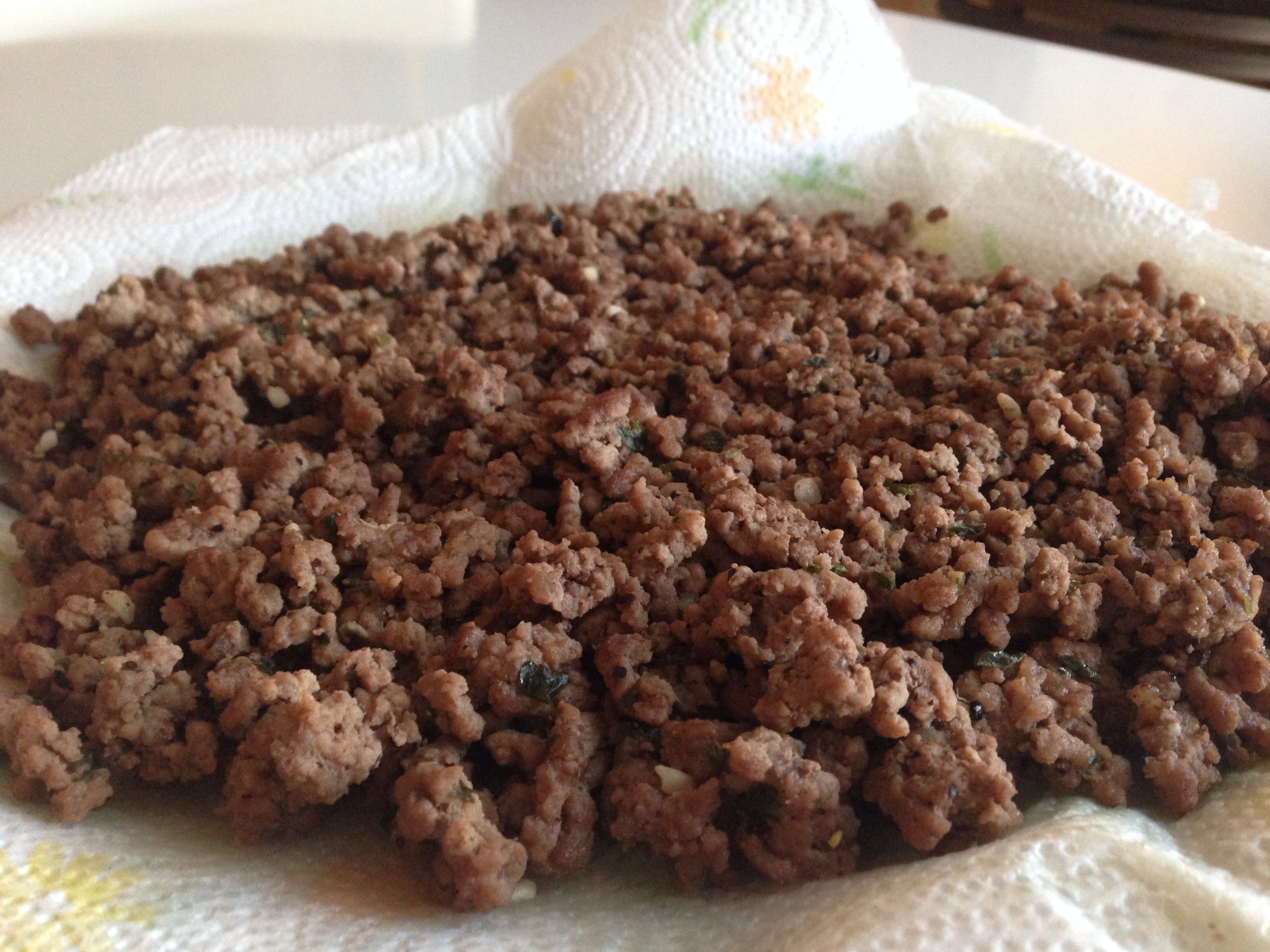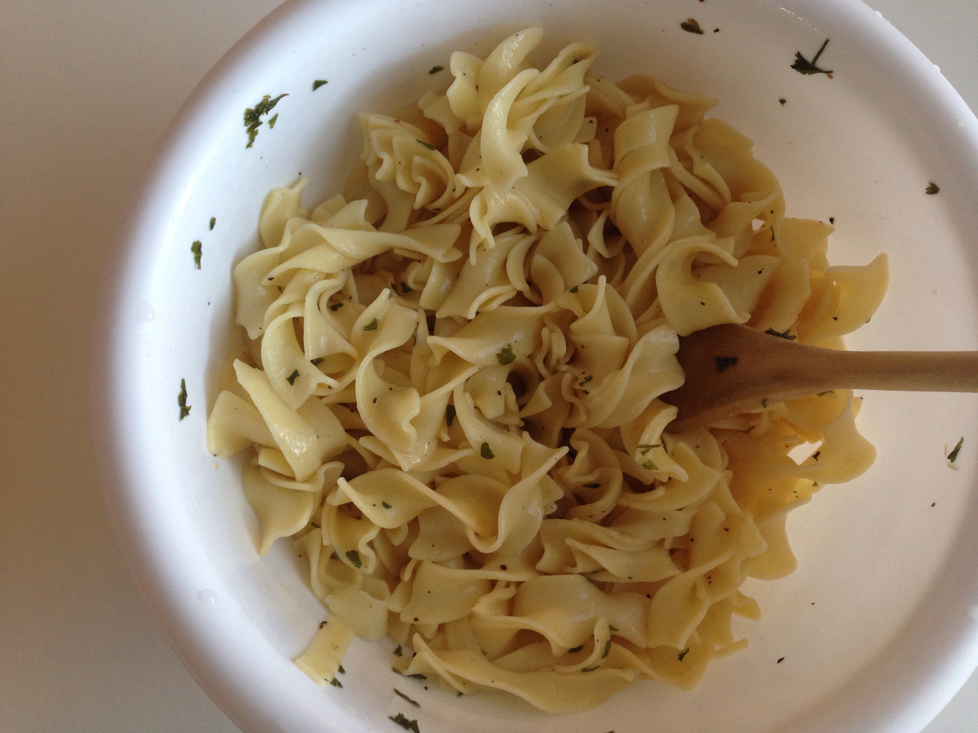 Once the pasta is al dente, drain water and place pasta in a medium size bowl. Add 1 tbsp of extra virgin olive oil, 1 tbsp of “can’t believe it’s not butter” and salt and pepper to taste. Mix the pasta so it is completely coated.