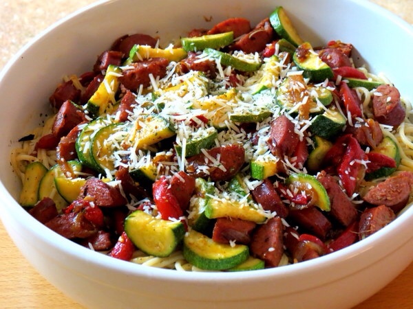 image July 20, 2014 600 × 450 image Kielbasa sausage, roasted red peppers and zucchini pasta with lemon pepper and olive oil sauce