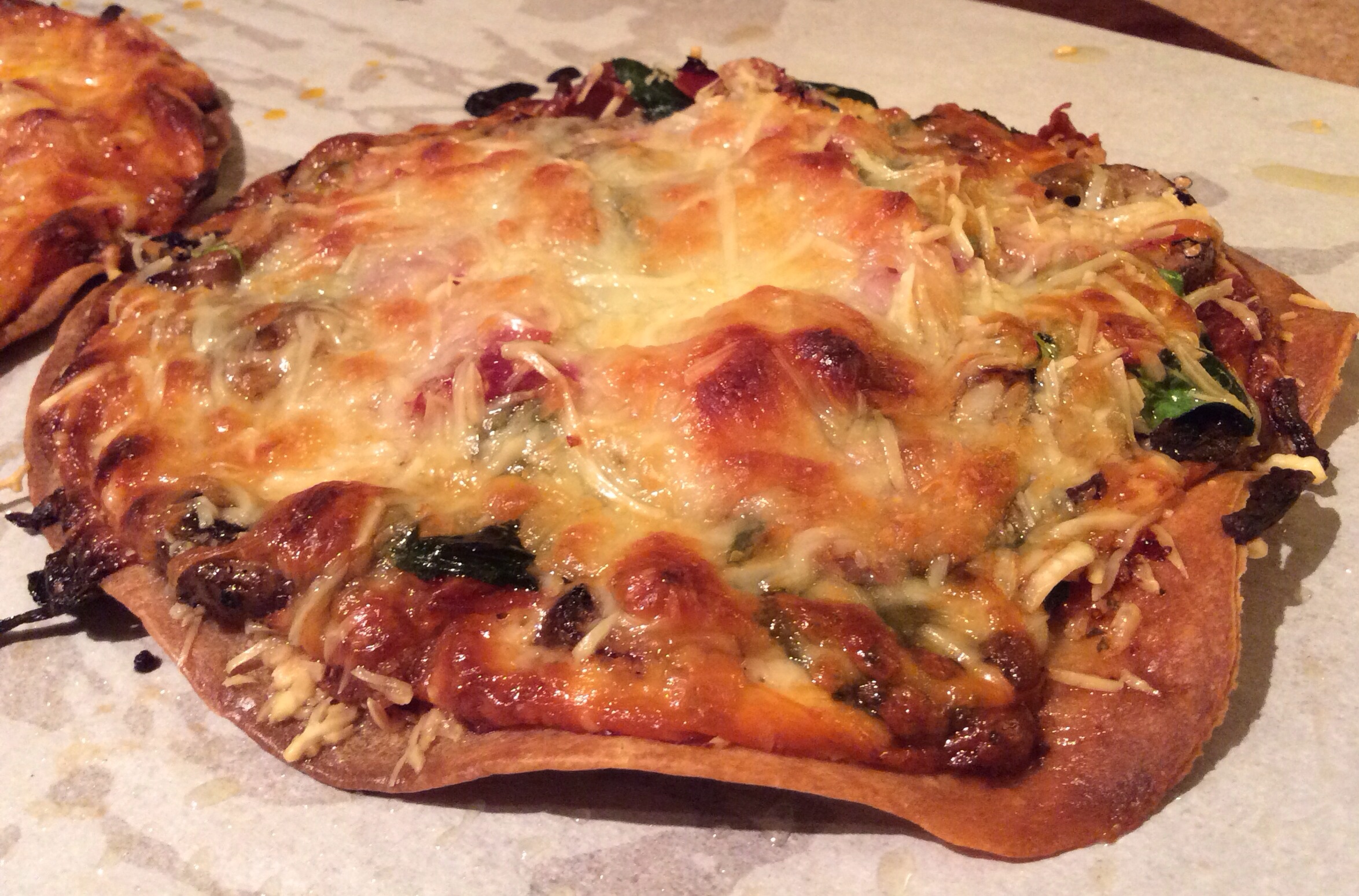 image August 25, 2014 2349 × 1549 image Easy to make Spinach, Mushroom, Proscuitto, bacon and Ham pizza
